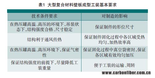 工裝是復(fù)合材料制件的成型基礎(chǔ),工裝既要保證復(fù)合材料制件的形位尺寸,同時又要充分適應(yīng)復(fù)合材料制件的成型工藝特點(diǎn)——傳熱、傳壓等,所以工裝技術(shù)是復(fù)合材料研制的關(guān)鍵因素,復(fù)材成型工裝基本要求如表1所示。
