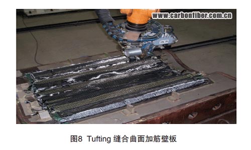 縫合時(shí)縫線幾乎處于自由狀態(tài),張力很小,僅靠縫線與預(yù)制體的靜摩擦力把縫線留在預(yù)制體內(nèi)部。因此,為了能保證縫線能順利留在預(yù)制體內(nèi)部,會(huì)在預(yù)制體鋪疊時(shí)加入少量定位膠黏劑來(lái)增大預(yù)制體與縫線的摩擦,從而保證縫合的順利進(jìn)行。在縫合泡沫夾芯預(yù)制體時(shí),定位膠黏劑作用不明顯,可以在預(yù)制體底部加襯一層薄橡膠,以達(dá)到留住縫線的效果,縫合完成后再取下橡膠。對(duì)于相對(duì)較薄的預(yù)制體也可以采用此種方法來(lái)提高Tufting縫合質(zhì)量。圖8是采用Tufting技術(shù) 縫合曲面加筋壁板。