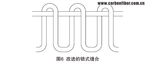 (1)鎖式縫合(改進(jìn)鎖式縫合)。因其工藝性較好在復(fù)合材料預(yù)制體研制中得到廣泛使用。傳統(tǒng)鎖式縫合方式較常見(jiàn),其特點(diǎn)是縫線和底線的結(jié)點(diǎn)在制件厚度的中間位置,這對(duì)于復(fù)合材料來(lái)說(shuō),結(jié)點(diǎn)處的應(yīng)力集中很大程度上會(huì)影響復(fù)合材料性能的提高。因此,在傳統(tǒng)鎖式縫合的基礎(chǔ)上進(jìn)行工藝優(yōu)化,出現(xiàn)了改進(jìn)鎖式縫合,圖6即為改進(jìn)的鎖式縫合。在復(fù)合材料縫合中,改進(jìn)鎖式縫合應(yīng)用較多,使用此縫合方式制件在厚度方向縫合線彎曲少,對(duì)面內(nèi)纖維的損傷少,由縫合引起的應(yīng)力集中也較小,因此使復(fù)合材料具有相對(duì)更高的損傷容限。 內(nèi)容來(lái)自123456