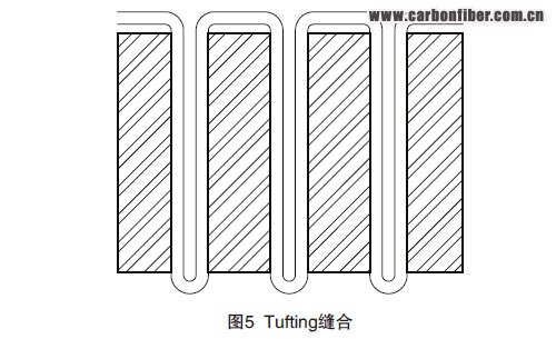 Tufting 縫合:縫針工作原理是縫針從預(yù)制體一面穿透制件,在縫針退出預(yù)制體表面后,把縫線留在預(yù)制體內(nèi)部,縫線軌跡如圖5所示。Tufting縫合是靠預(yù)成型體與縫線之間的摩擦力把縫線留在預(yù)制體內(nèi),所以在制件內(nèi)部也沒(méi)有結(jié)點(diǎn),由縫線引起的應(yīng)力集中較小。由于Tufting的單面縫合特性,所以同樣適用于結(jié)構(gòu)形式復(fù)雜的纖維預(yù)制體縫合。