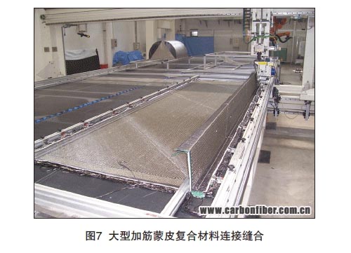 鎖式縫合因其受雙面縫合的工作原理所限,對(duì)預(yù)成型體的縫合工作只能在縫合設(shè)備工作平臺(tái)上完成,所以通常此種縫合方式只適用于曲率相對(duì)較小的預(yù)制體上,縫合厚度可達(dá)20mm。鎖式縫合對(duì)縫線的張力可做相應(yīng)調(diào)節(jié),因此在沒(méi)有特殊定位要求的情況采用鎖式縫合無(wú)需對(duì)預(yù)制體使用定位膠粘劑。通過(guò)調(diào)節(jié)鎖縫,復(fù)合材料加強(qiáng)筋與蒙皮連接的結(jié)構(gòu)應(yīng)用鎖式縫合較多,在靠近立筋的縫合區(qū)需要更換小壓腳來(lái)保證縫針靠近加強(qiáng)筋根部從而完成縫合。圖7為應(yīng)用鎖式縫合對(duì)復(fù)合材料大型加筋蒙皮的連接縫合。