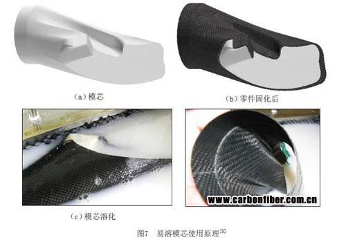 易溶模具是指采用在某種溶劑中易于溶解的材料運(yùn)用澆鑄法或模壓法制成空心或?qū)嵭牡哪>?。?fù)合材料構(gòu)件依賴這種模具成型后,從開(kāi)口處通入合適溫度的溶劑,使模具材料溶解進(jìn)而從構(gòu)件中流出。低溶鹽和石膏是常用的芯模材料。另外,水溶性型芯材料也可由粘結(jié)劑和陶瓷填料組成,粘結(jié)劑為有機(jī)高分子材料,具有脫水固化、遇水溶解的可逆特性;陶瓷填料由氧化鋁和高嶺土組成,陶瓷料漿的固相體積分?jǐn)?shù)使粘結(jié)劑具有良好的水溶性和高的熱分解溫度[7]。圖7為易容模芯的使用原理。 123,123