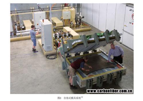 自容式模具(圖3)系統(tǒng),加熱和加壓是模具的一部分,熱源可以是電、熱油或蒸汽,能夠解決一些熱壓罐的不足之處,可以用來(lái)生產(chǎn)大于現(xiàn)有設(shè)備的零部件,且具有成本低、升壓速度快、溫度控制精確的優(yōu)點(diǎn)。