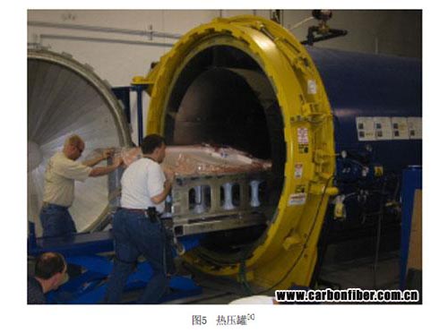 模具加熱系統(tǒng)主要分為:熱氣外部加熱,通常采用熱壓罐(圖5)或水壓罐加熱;模具本身或與模具緊密接觸臺(tái)板的電加熱;電加熱毯局部加熱;模具或臺(tái)板內(nèi)部的流體加熱,通常采用蒸汽或熱油;高速噴射氣流加熱系統(tǒng);微波加熱和感應(yīng)加熱系統(tǒng),主要用于小零件,對(duì)于較厚的層合板,可使其從內(nèi)到外發(fā)生固化。 本文來(lái)自123