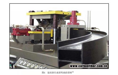 連續(xù)擠壓是一種多工步過(guò)程,其成型模具為組合式,多運(yùn)動(dòng)部件組成。首先多層熱塑性帶在模具中加熱并壓成層合板,而后將層合板壓入成型模具并加熱壓成所需截面的型材,最后將型材通過(guò)連續(xù)壓模壓成所需的彎曲形狀,這種方法可以成型彎曲甚至扭轉(zhuǎn)和變截面的型材零件,是一種新型的成型工藝。圖4為其成型模具和設(shè)備。