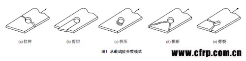 其中拉伸失效、剪切失效以及擠壓失效是因承受面內(nèi)載荷而發(fā)生的;當(dāng)承受面外載荷時(shí),緊固件還可能從接頭中拉出,即所謂的“拉脫”。層板的拉伸失效與基體和纖維的拉伸失效有關(guān),通常發(fā)生于寬徑比很小,或者旁路載荷與緊固件承載比較大時(shí)。剪切破壞和擠壓破壞則主要是由纖維和基體的壓縮破壞引起的。拉伸破壞與剪切破壞是災(zāi)難性的,而擠壓破壞則是隨載荷和時(shí)間慢慢累積的,是結(jié)構(gòu)局部的失效,不會(huì)帶來結(jié)構(gòu)的災(zāi)難性破壞[8]。在以上幾種破壞模式的基礎(chǔ)上,隨載荷及時(shí)間的變化,當(dāng)結(jié)構(gòu)擠壓破壞后,還可能發(fā)生一系列后續(xù)的破壞[9],如圖1中的(d)和(e)所示。實(shí)際應(yīng)用中復(fù)材接頭可能存在多種破壞模式,發(fā)生混合破壞,使得接頭設(shè)計(jì)和分析更加困難[10]。