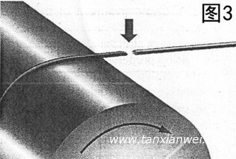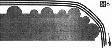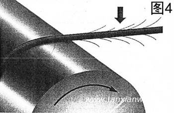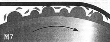 德國TOPOCROM公司開發(fā)了適用于碳纖維加工過程的導絲輥和其元件(圖2)。一般的羅拉在導絲過程易產生斷絲(圖3)或毛絲(圖4),由此常發(fā)生中斷現(xiàn)象,而該公司設計的羅拉表面如圖5所示,絕對無銳邊并形成“軟”形態(tài)(圖6),在絲束行進過程形成氣墊而有利于更好滑動(圖7),總之,它適用于加工碳纖維、芳綸、玻纖、陶瓷纖維及玄武巖纖維,而且具有高耐磨和耐腐蝕性、壽命長、均勻的表面結構而有利于纖維的緩和處理,可達到最佳拉伸狀態(tài)、滑動性良好,并具有良好的緩沖和減震作用。