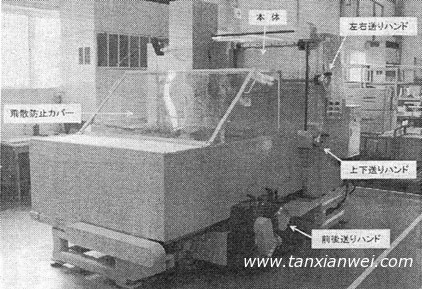 玉川工業(yè)公司開發(fā)了高精度的CFRP大型板材的切斷裝置,可加工厚度200mm、寬200mm、長1.2m的板材,該切斷機有7大特點:①將4角支撐組合起來,并裝備采用密閉式的無油心軸,使偏差和耐久性獲得飛躍式提高,并實現(xiàn)免維修;②隨著主軸剛性的提高,可搭載1.5kW的馬達。③由于砂輪頭和工作臺可以旋轉,可一次裝卡而同時進行垂直和平行加工;④通過控制變換器調整切速改進容量,可自由選擇切速;⑤提高工作臺前后動作部件的剛性,而且前后的輸送罩采用可動式,以防止雜物進入;⑥全軸可決定高精度的位置;⑦為保持柱子的剛性,采用兩端支柱和橫軸滑動梁的門型結構。機械尺寸寬2.3m、長3.2m、高2.15m,重2.5t,外形如圖8所示。