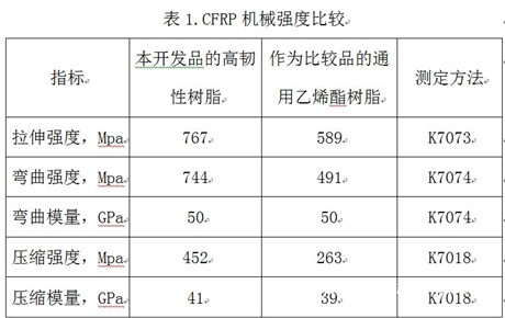 2011年DHM公司曾開發(fā)兼有強度和耐疲勞性的CFRP用高韌性樹脂,2012年通過樹脂基體骨架設計和分子量最佳化,在開發(fā)適用于注射和真空成型用的CFRP高韌性樹脂,其中CF與樹脂界面的粘合性好,其機械性能如表1所示。